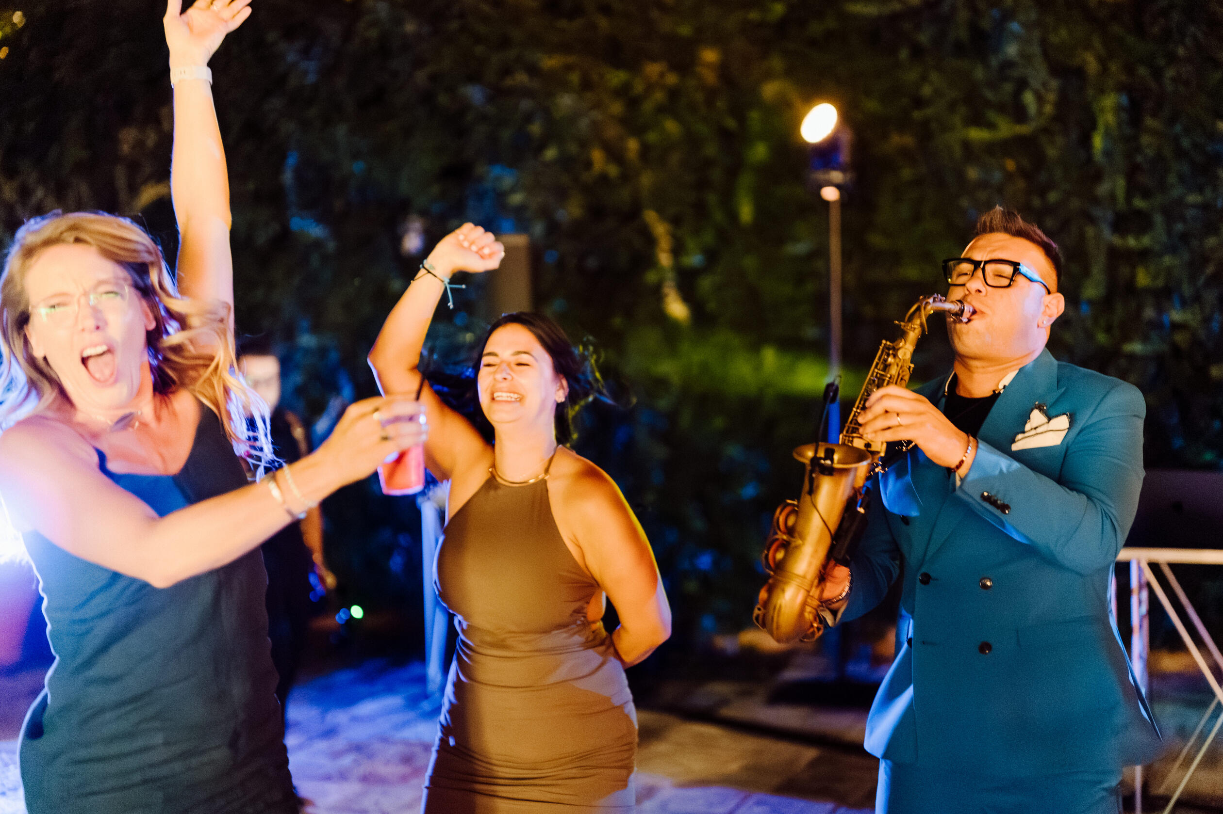 Le parentesi di ballo vengono costruite alternando set DJ e interventi live al sax, creando una dinamica fluida che accompagna naturalmente la giornata.Ogni intervento è pensato per coinvolgere gli ospiti, nel momento giusto, mantenendo sempre equilibrio tra festa ed eleganza.